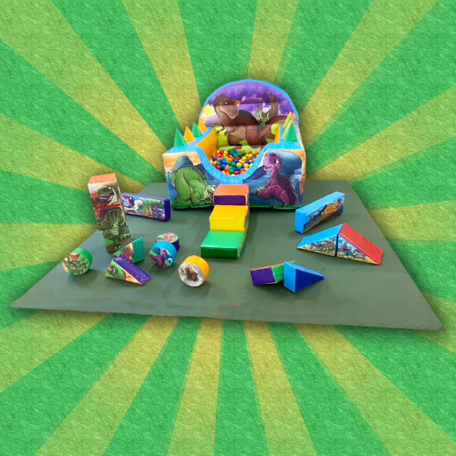 Dinosaur themed softplay layed out on 12ft x 12ft of padded mats with 17 dinosaur themed shapes and a Inflatable themed ball pool.
