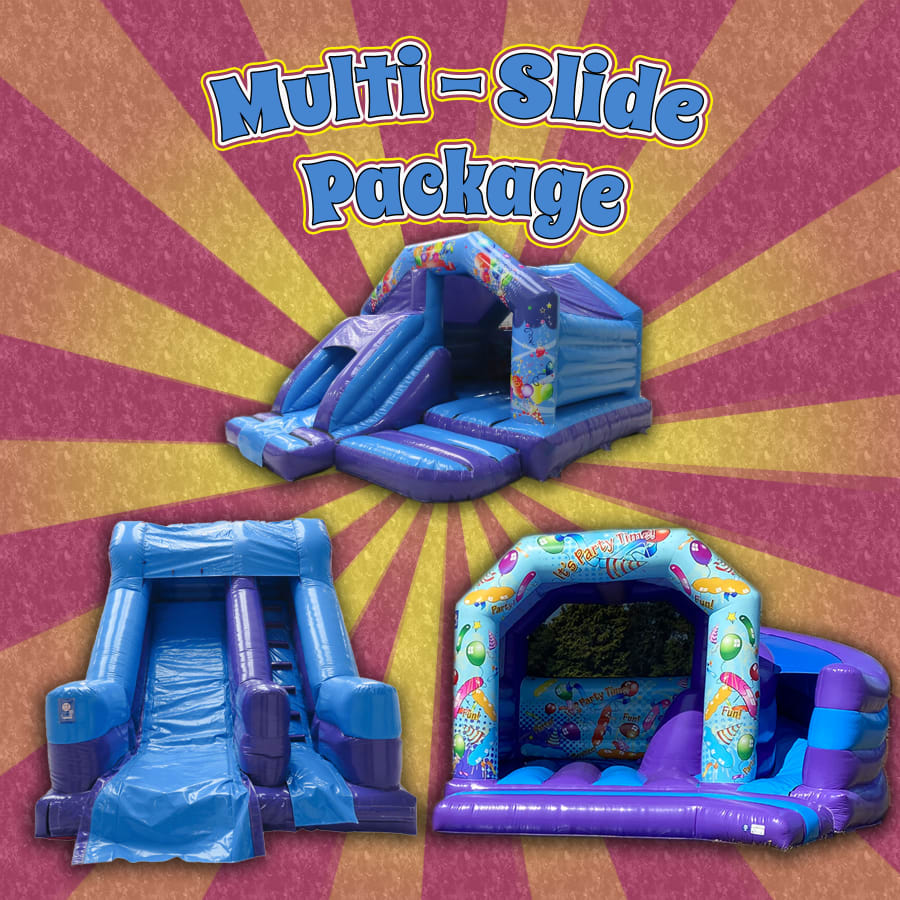 Here is our Bounce and Slide Package which includes a 10ft platform slide, our 180 degree side slide and our 18x12 ft Celebration front slide.