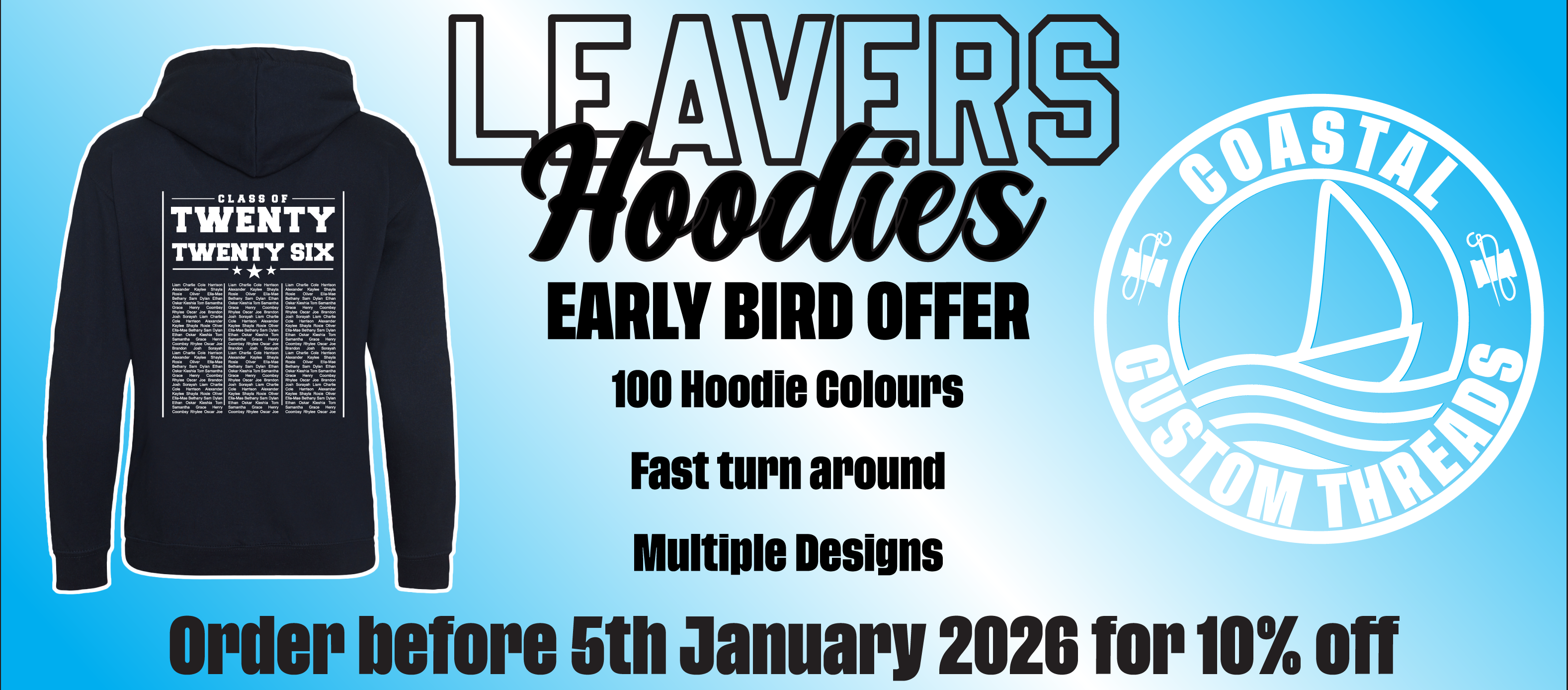 - Leavers hoodies — custom prints, colours and names for school year groups.